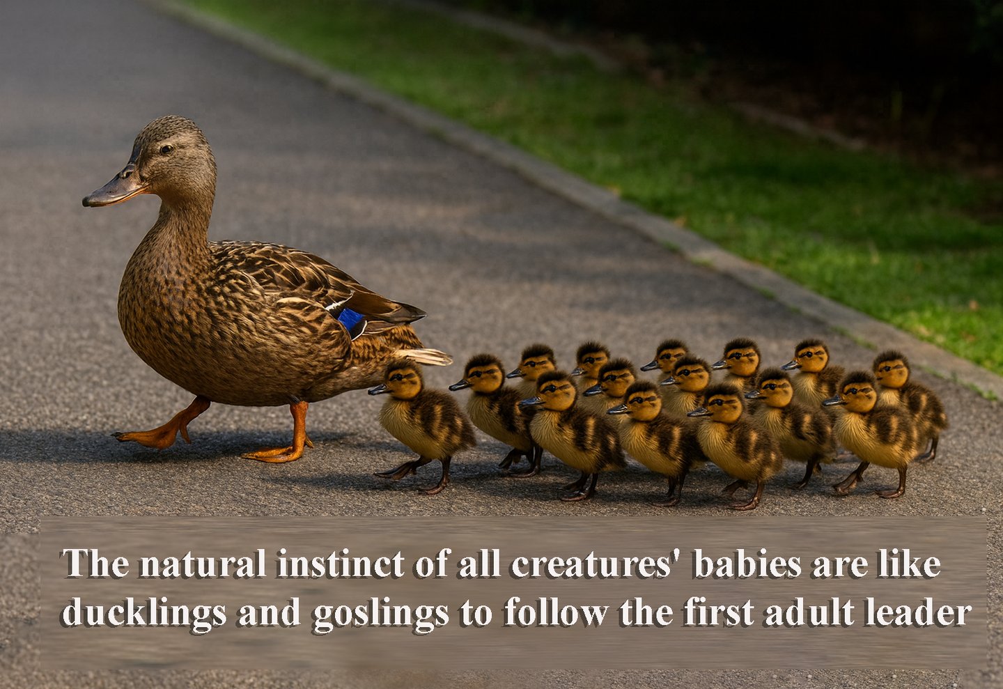 The natural instinct of all creatures’ babies — like ducklings and goslings — is to follow the first adult leader.
